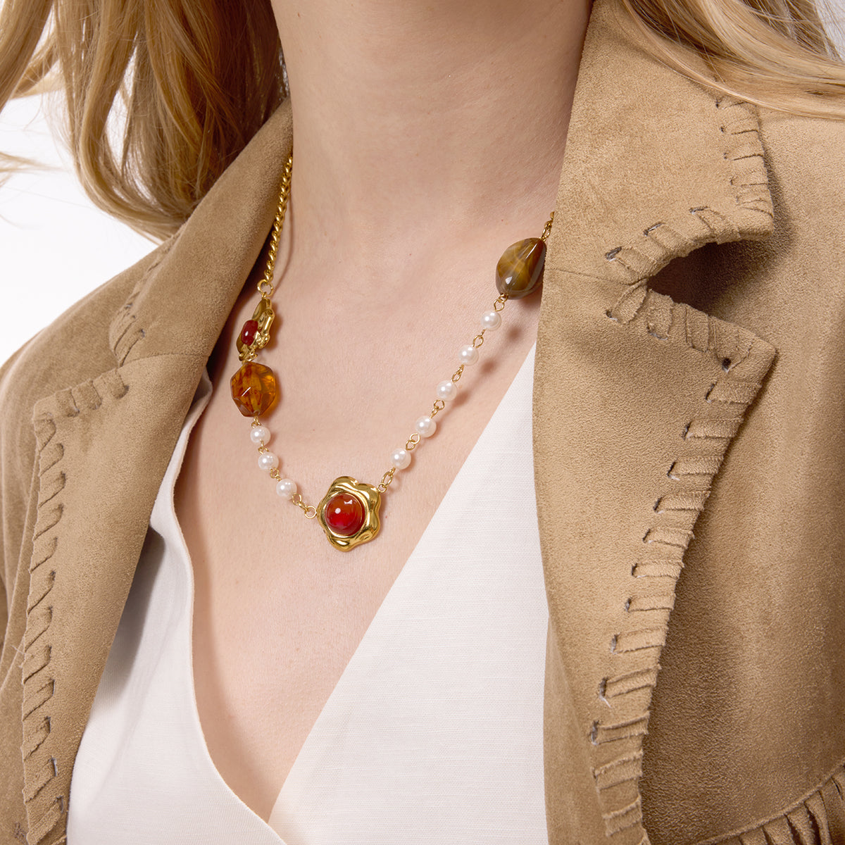 Tigrana by Saga & Segust embodies the strength of the earth and the glow of passion. Crafted in fine stainless steel with a luxurious 18K gold plating, this exquisite pendant features a five-petal floral design combining the golden-brown shimmer of tiger’s eye with the deep warmth of red agate. Each element reflects confidence, balance, and inner light. Waterproof, hypoallergenic, and tarnish-resistant, Tigrana is more than jewelry — it’s a symbol of grounded grace and radiant energy.