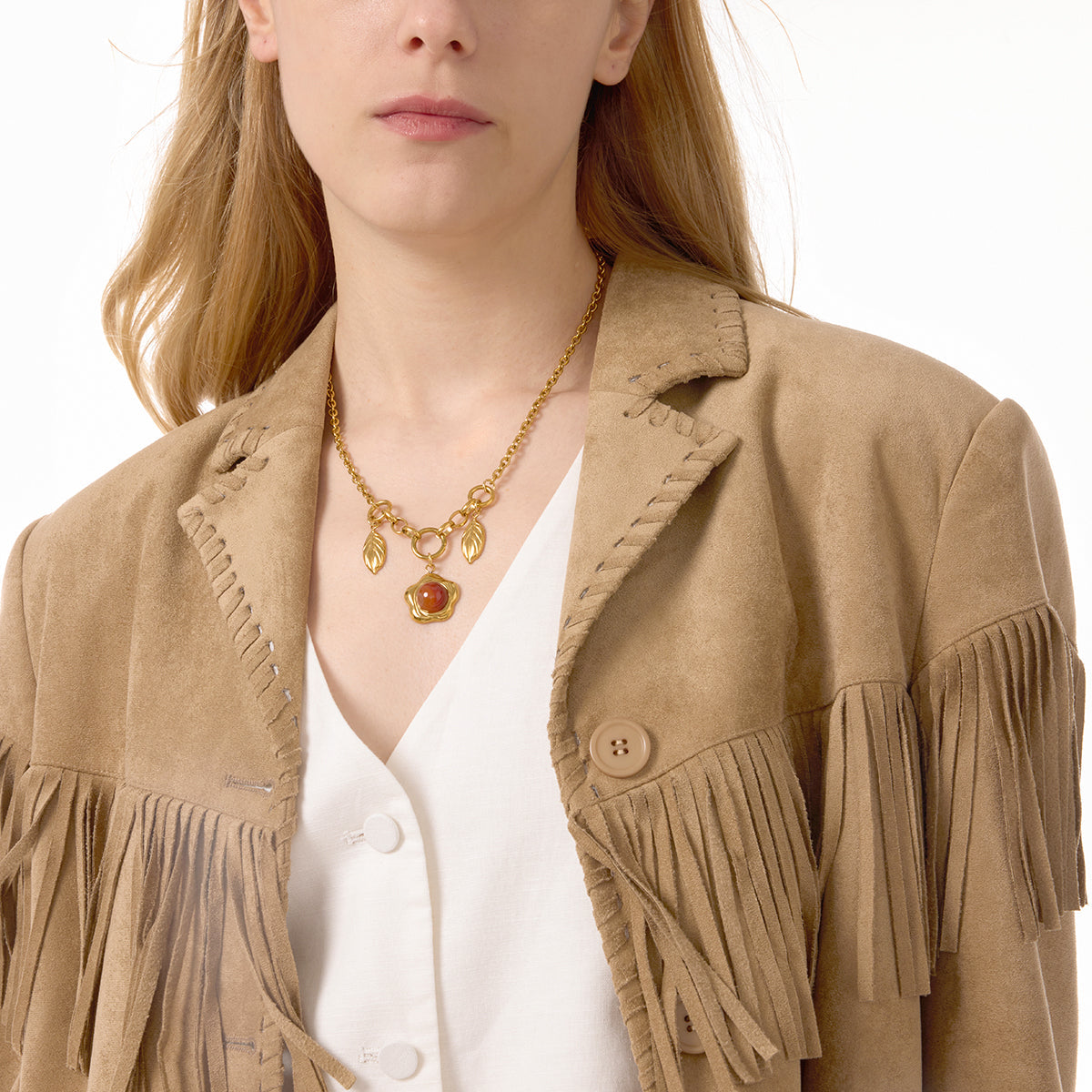 Flamara by Saga & Segust embodies the radiant spirit of nature. This exquisite pendant necklace features a five-petal frangipani flower crafted from deep red agate, set in luminous 18K gold-plated stainless steel and complemented by a delicate golden leaf. Symbolizing vitality and harmony, Flamara glows with tropical warmth — a timeless piece of art designed to uplift and inspire. Waterproof, hypoallergenic, and tarnish-resistant, it’s elegance made eternal.